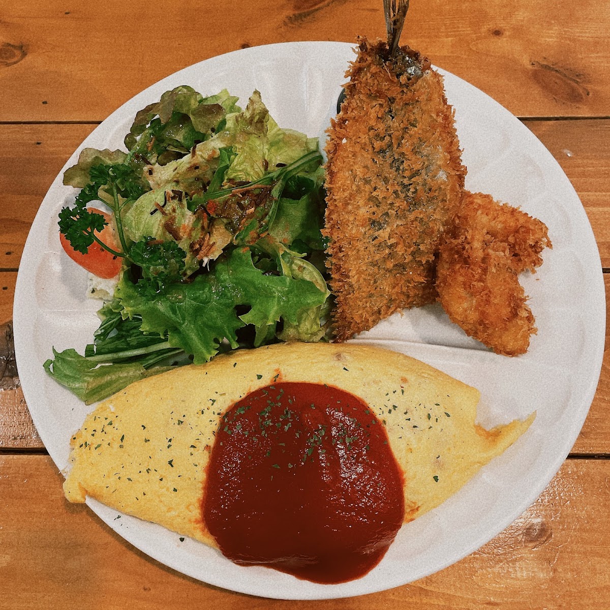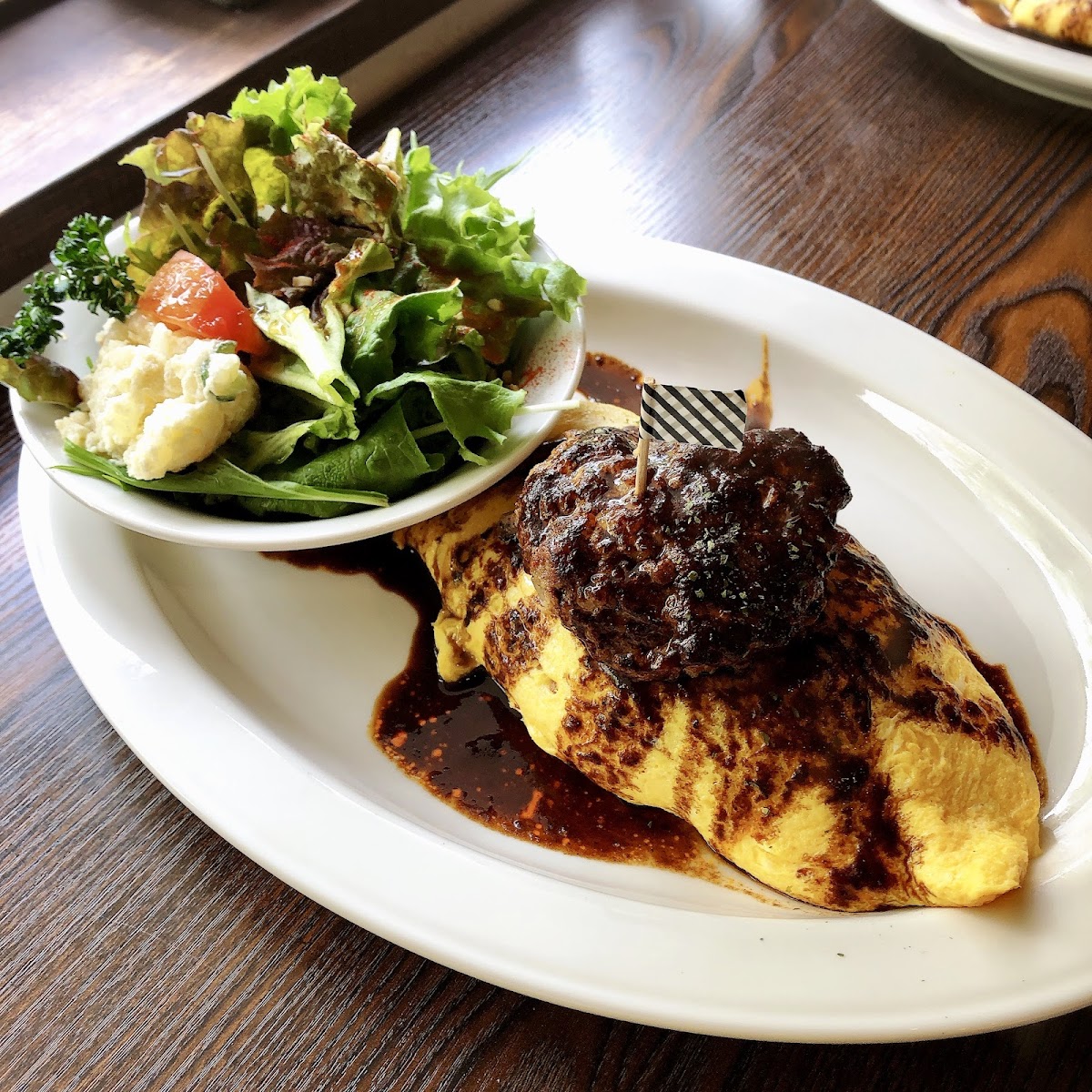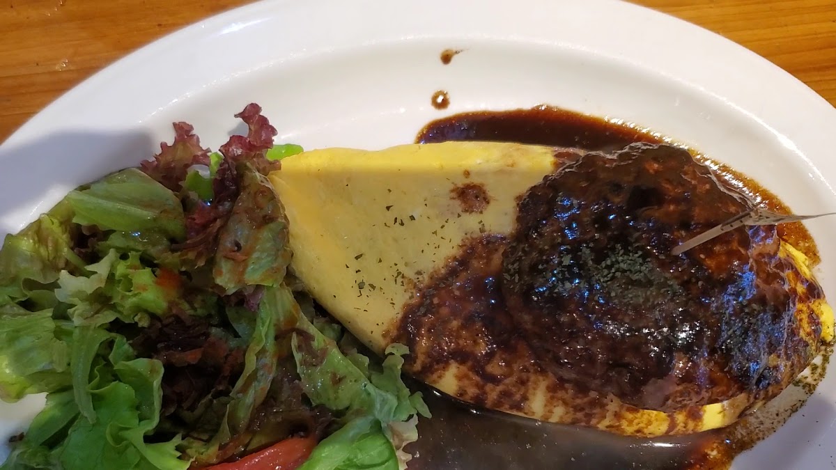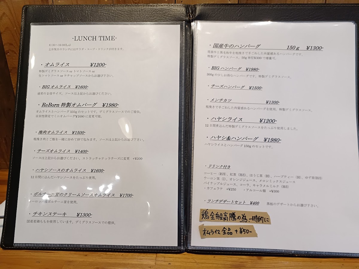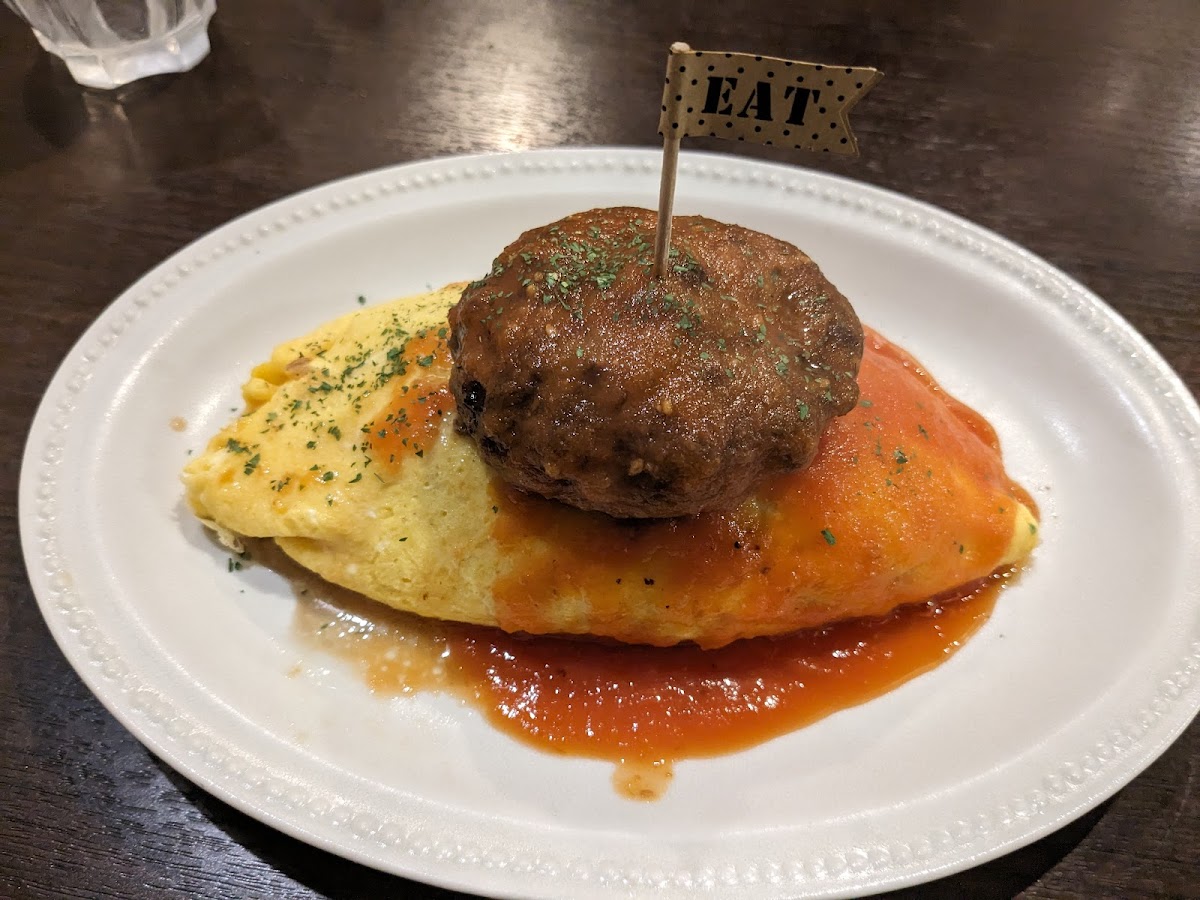 Cafe & Kitchen ReBorn specializes in Western-style dishes that are both delicious and affordable. One standout on the menu is the ReBorn Special Omurice (¥2,050). This dish features a juicy, coarse-ground hamburger served atop a bed of fluffy chicken rice enveloped in perfectly scrambled, creamy eggs. The rich and slightly bitter demi-glace sauce enhances the decadent flavor, making each bite an explosion of savory goodness. Don't just take our word for it—customers rave about the happiness this dish brings, describing it as a "dream collaboration of Western cuisine."